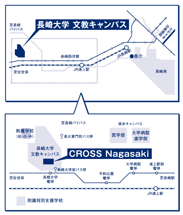 浦上経由長崎方面行きバス「昭和町(しょうわまち)」で下車し、徒歩で長崎大学東門まで約15分あるいは長崎大学正門まで約20分
